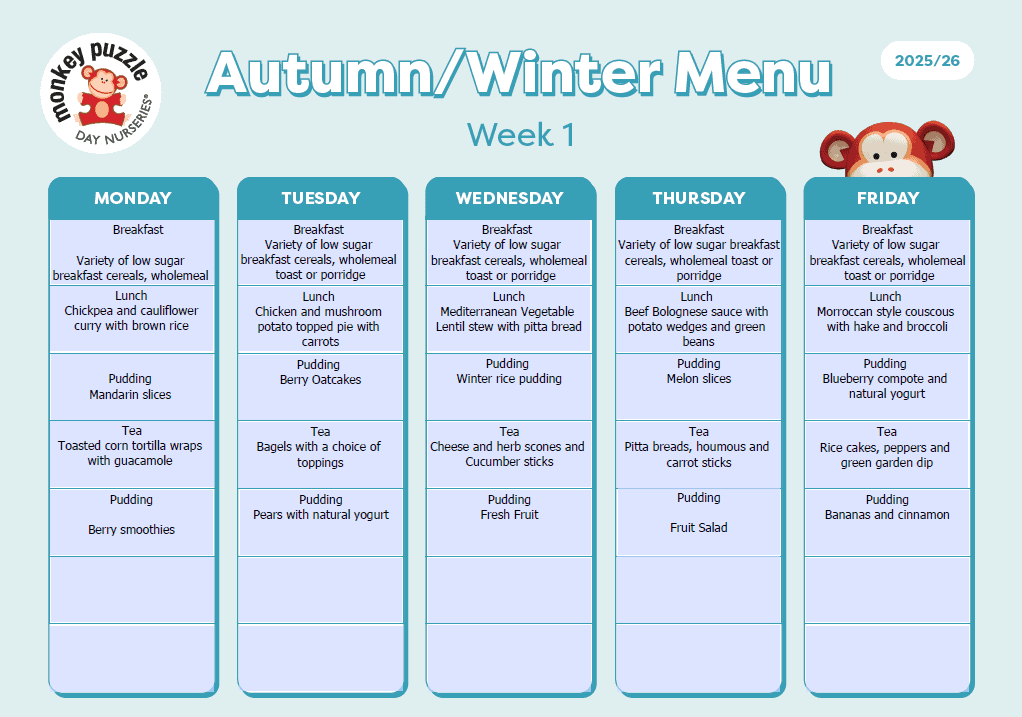 At Monkey Puzzle, we believe that healthy eating in childhood lays the foundation for a lifetime of good habits. Our approach to early childhood nutrition ensures every child enjoys balanced, freshly prepared meals that meet their childhood nutritional needs. Each dish is designed to support growth, learning, and wellbeing, with mealtimes that are a happy, sociable part of their day.
